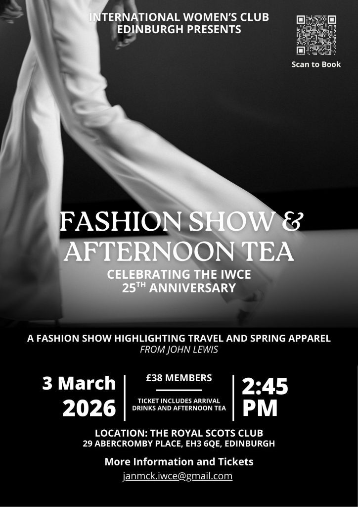 A Fashion Show highlighting travel and spring apparel from John Lewis (the outfits will be modelled impressively by IWCE members, and introduced by one of John Lewis’s personal stylists!) will add a touch of glamour to the afternoon’s programme. Hosted by the International Women’s Club Edinburgh on their 25th Anniversary.