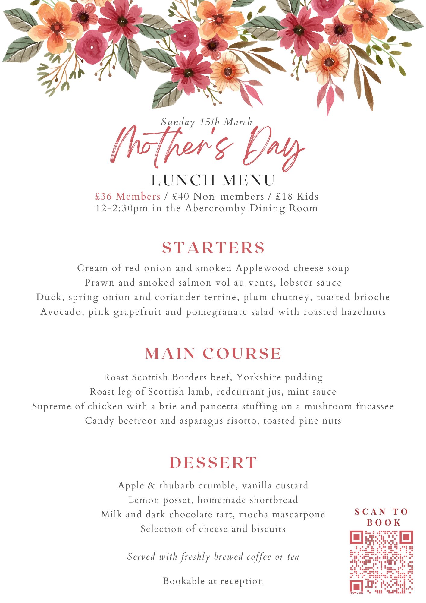 Treat your mum to a delicious three-course lunch with tea/coffee in our beautiful Abercromby Dining Room for just £28 per person. Book a table of four and mum eats free.*